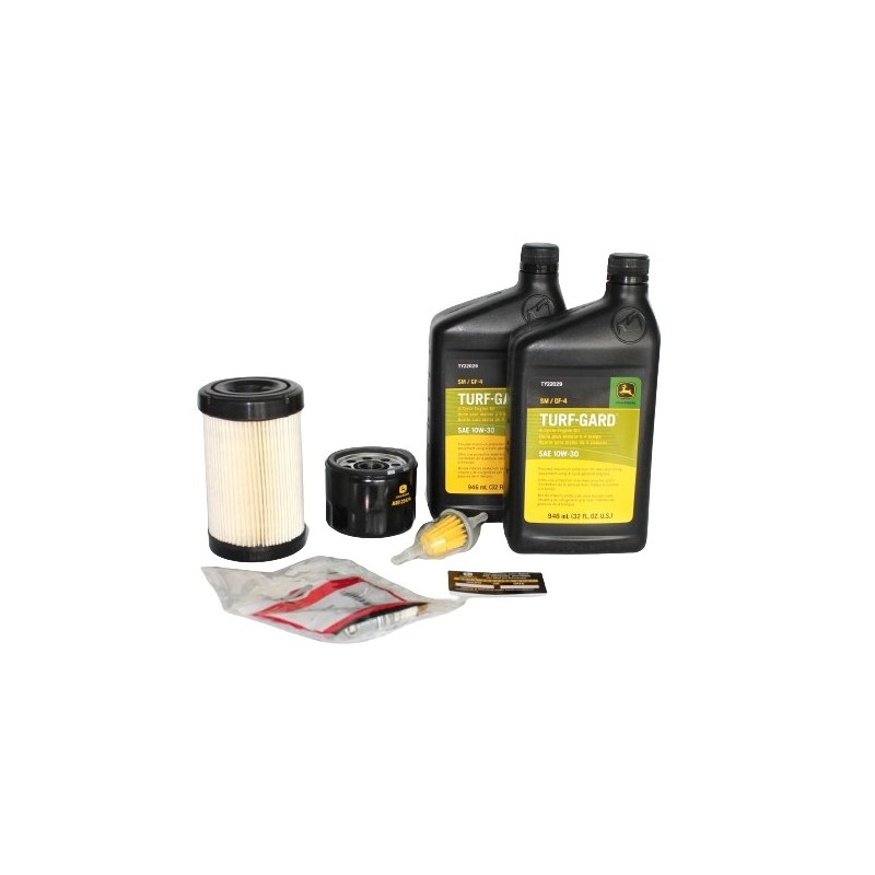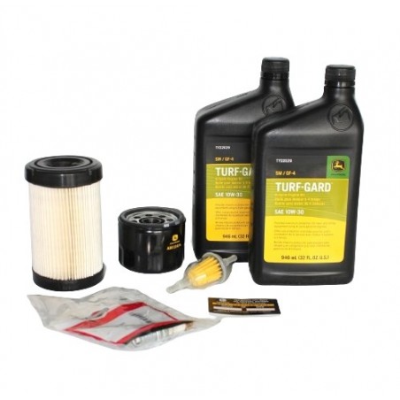 Zestaw zawiera filtr paliwowy, filtr oleju silnikowego, etykietę wymiany oleju, świecę zapłonową, filtr powietrza, 2X Oleje silnikowych TURF-GARD 10w30